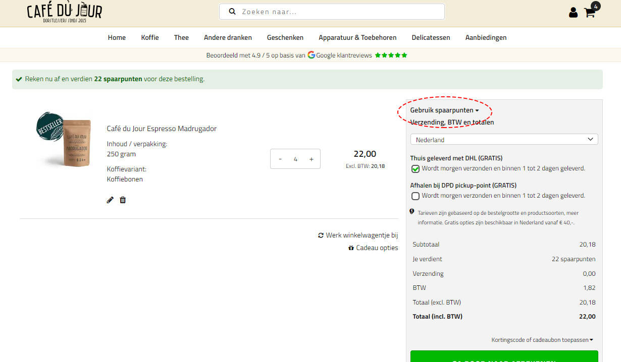 Du kannst deine gesammelten Punkte im Warenkorb gegen einen Rabatt auf deine Bestellung einlösen. Dies ist nur möglich, wenn der Bestellwert höher als €10,- ist. In deinem Warenkorb siehst du oben rechts die Option "Punkte verwenden" (über dem Versandkostenblock), sofern du genügend Punkte hast. Jeder Punkt entspricht einem Wert von €0,01, und du kannst selbst entscheiden, wie viele Punkte du für den Rabatt verwenden möchtest.